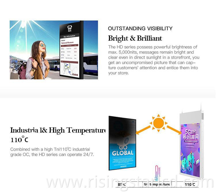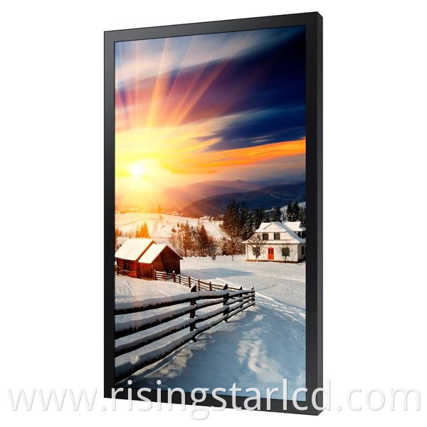 49 inch window facing dispaly adopts RisingStar RGBW industrial grade OC and with  own design led backlight module which increased brightness of 3,000nit(typical), its Slim & Robust Design easliy installed in store windows, OD series of advertising display lcd captivates customers with its vivid image quality and quiet operation. The 49 inch advertising digital machine helps business enhance their brand image while enriching the customers’ shipping experience. This 49 inch lcd advertising television customized brightness: 1,500nit 2,000nit 2,500nit 3,000nit