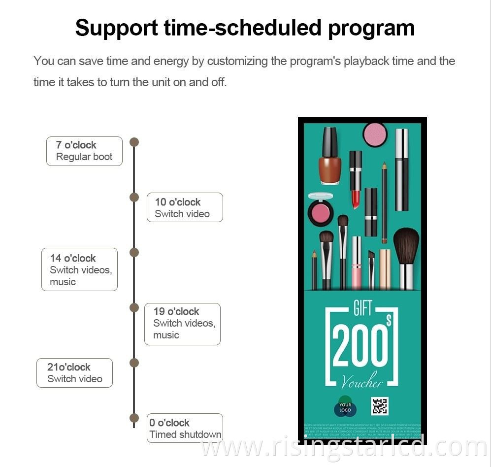 2. Multi-groups of on/off time schedule could be setted remotely and control the display through Internet.